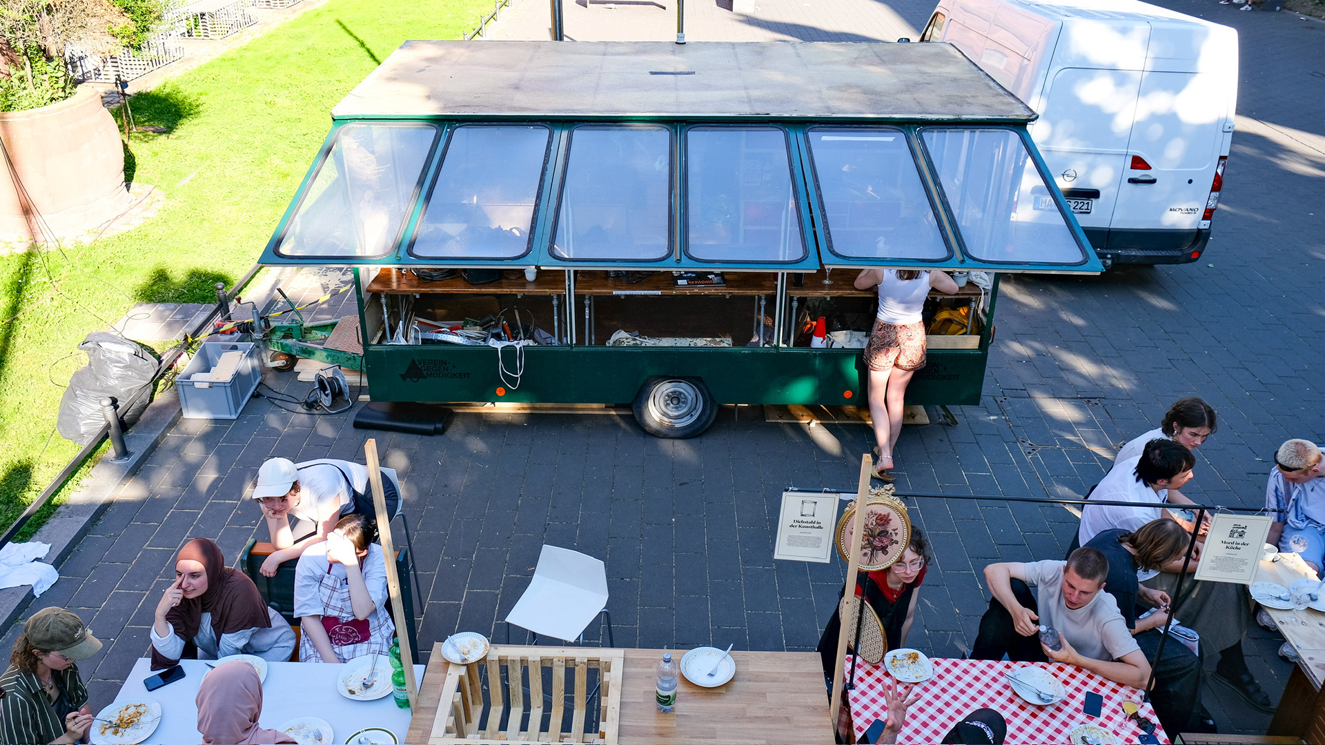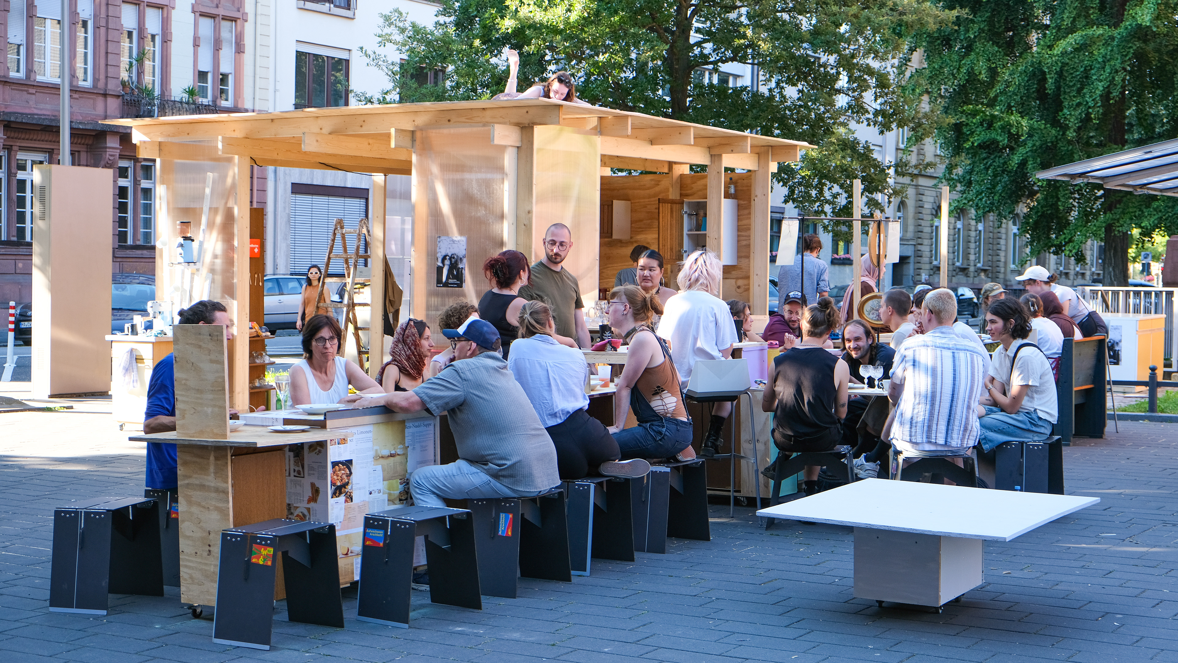 In the summer of 2024, we built a fully functional kitchen in Skulpturenplatz, Mannheim. The themes of "How to Live Together", the course from which this project originated, were meant to naturally unfold within the intimate space of the kitchen.